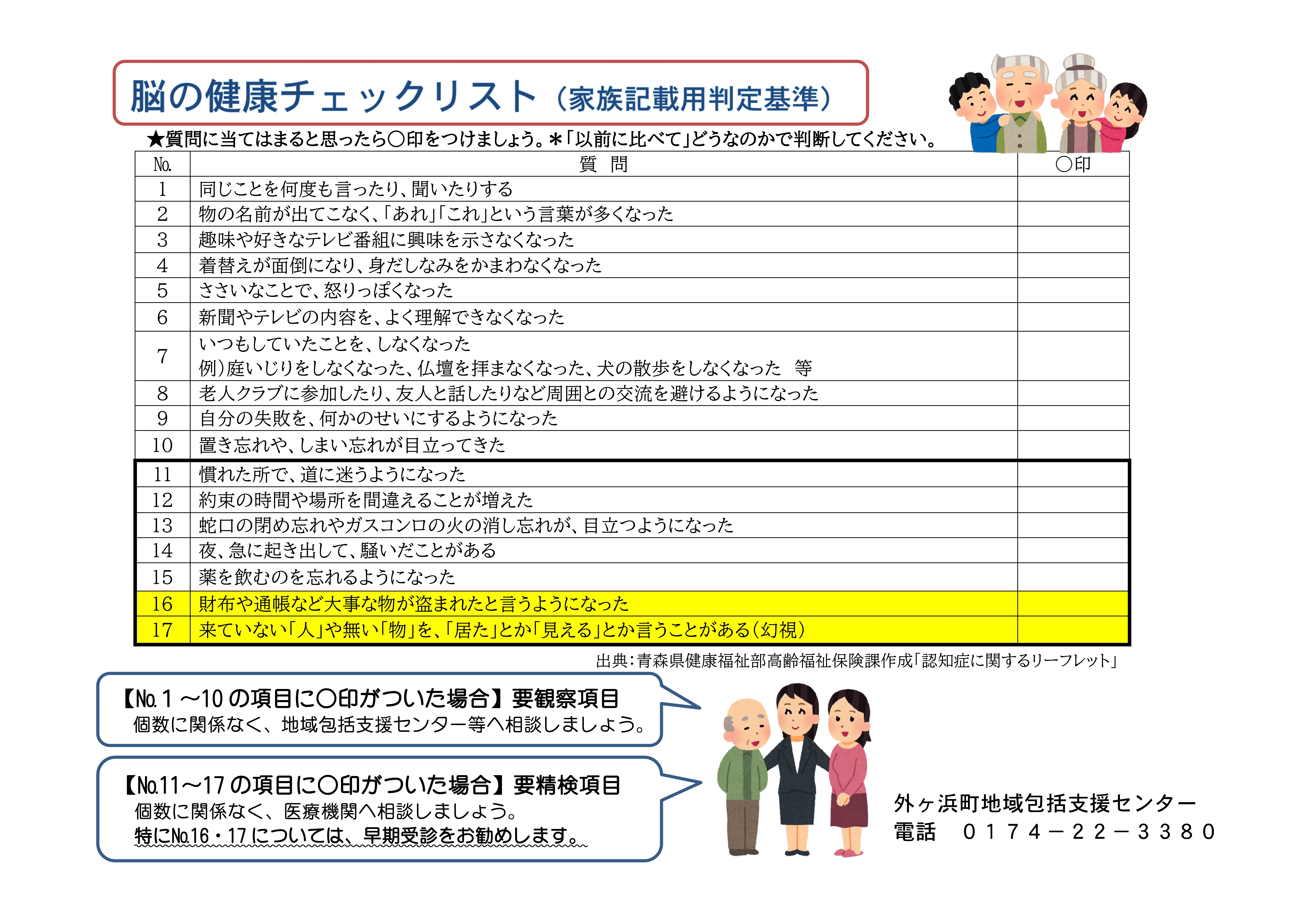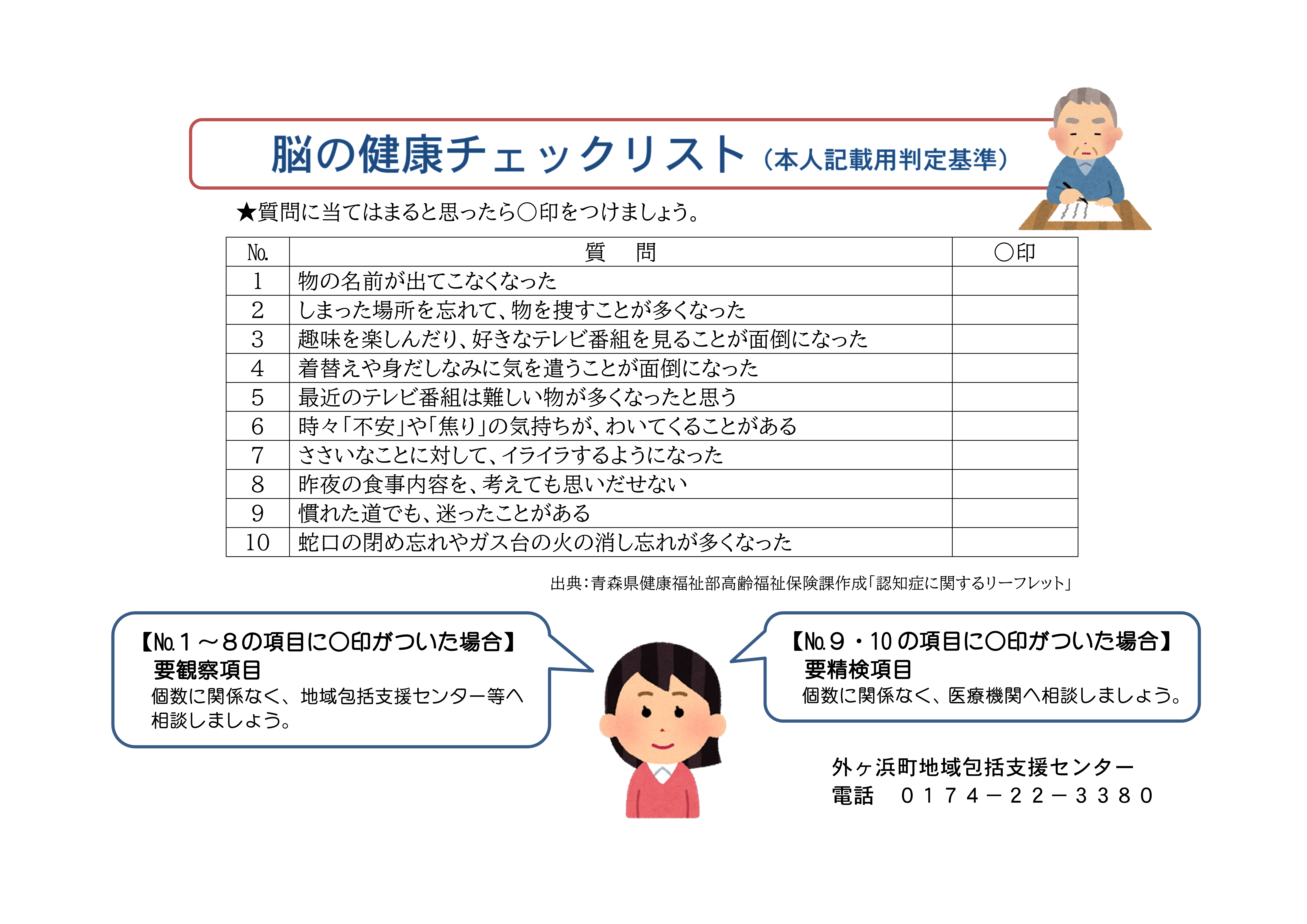 *No.1~10の項目に○印がついた方は、個数に関係なく外ヶ浜町地域包括支援センターへご相談ください。